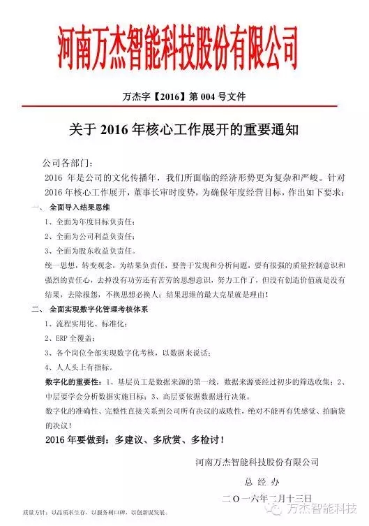 送走了不平凡的2015,迎來了嶄新的2016。萬杰智能科技股份有限公司于2016年2月13日(農歷正月初六)正式開工。一年之計在于春,現在zui重要的是做好新年的各項工作,努力完成今年各項目標任務,推動核心工作再上臺階。 2016年,是萬杰智能的文化傳播年,我們所面臨的經濟形勢更為復雜和嚴峻。董事長王曉杰審時度勢,為確保年度經營目標,針對2016年核心工作展開提出兩個全面要求: 一、全面導入結果思維:為年度目標負責任、為公司利益負責任、為股東收益負責任。 二、全面實現數字化管理考核體系:做到流程實用化、標準化;ERP全覆蓋;以數據來說話;人人頭上有指標,絕對不能再有憑感覺、拍腦袋的決議。 在2016年萬杰智能全體同仁應以更加飽滿的熱情投入到工作中,盡快地進入工作狀態,更要發揮兢兢業業、一絲不茍的精神,腳踏實地,忠實履行崗位職責,以更大的熱情向前邁進。 2016年務必要做到:多建議、多欣賞、多檢討! |